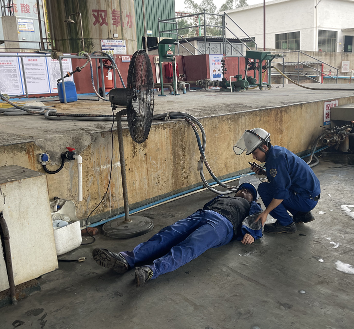 模擬三酸車間充裝人員在作業(yè)過程中挪動風(fēng)扇時(shí),濕手不小心觸碰到破損的電纜線導(dǎo)致觸電。附近正在作業(yè)的同事發(fā)現(xiàn)有人觸電后立即大喊:“有人觸電了,有人觸電了”,同時(shí)迅速斷開該電纜線電源開關(guān)。周邊同事聽到后,迅速過來幫助受傷人員躺平,并按照相關(guān)程序及時(shí)上報(bào)。查看傷勢情況,隨后立即組織人員報(bào)120并對受傷者進(jìn)行心肺復(fù)蘇,待120急救車到來后,協(xié)助120急救人員抬上急救車并安排人員一同前往,妥善處置。